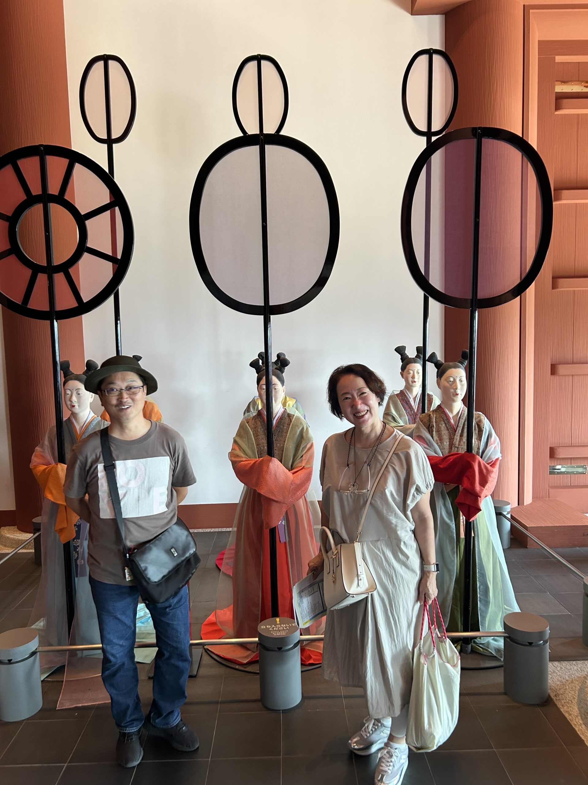 原寸大に復元した空間では、直径70センチもある朱塗りの円柱が立ち並び、官人たちが整列。