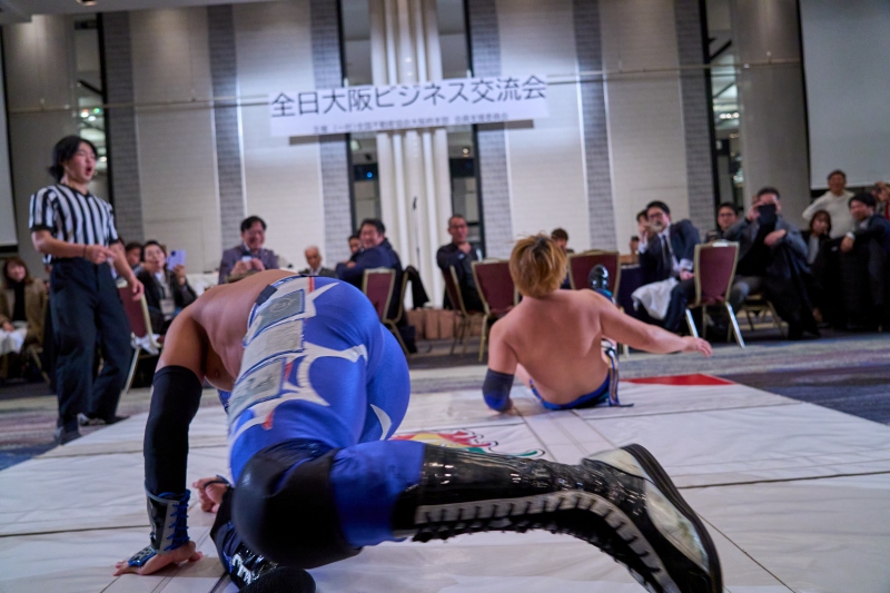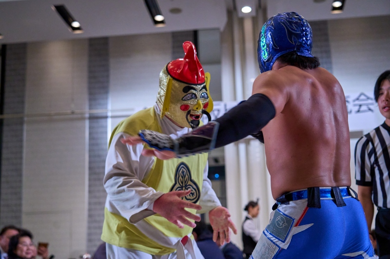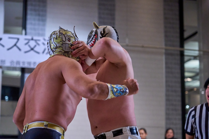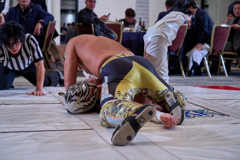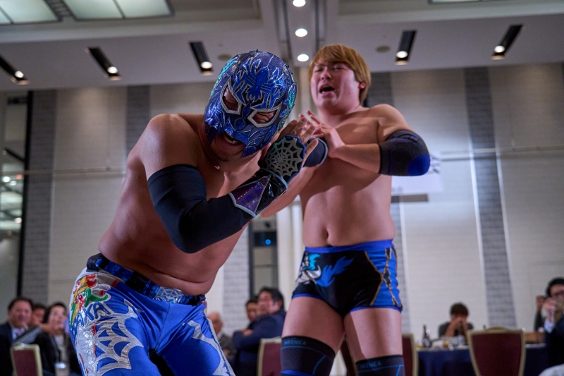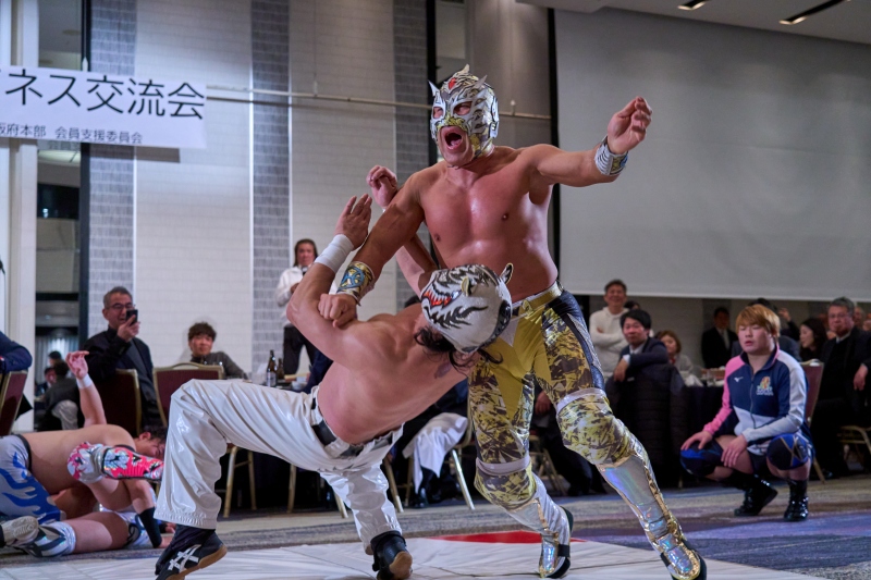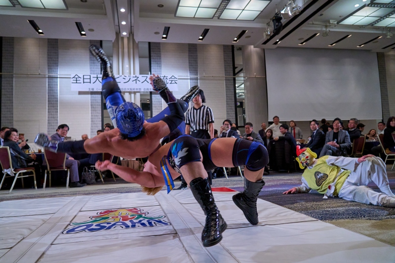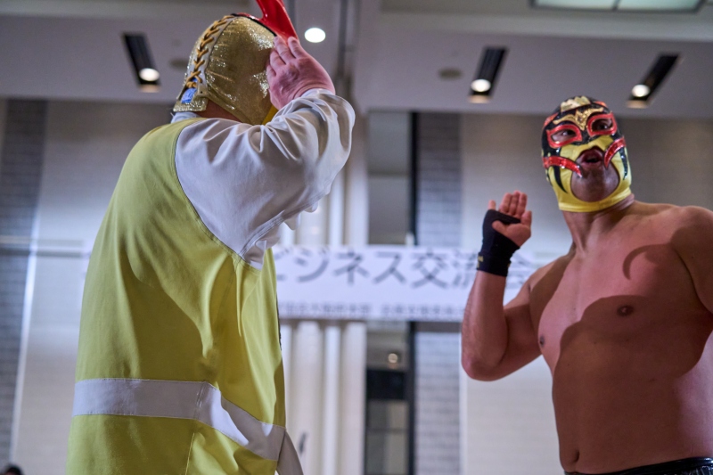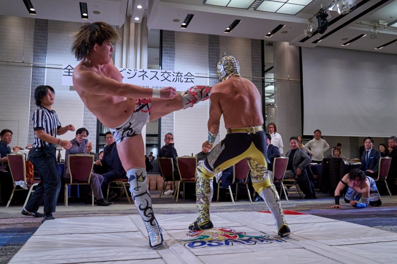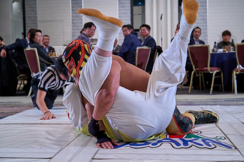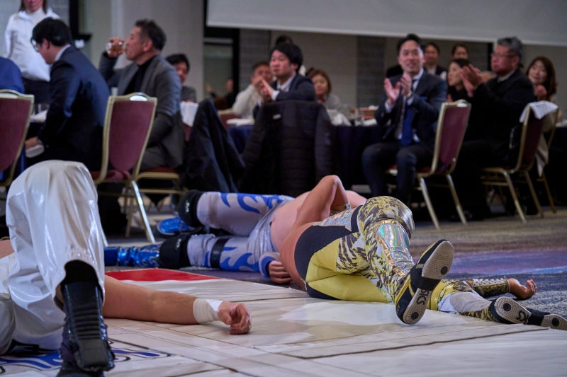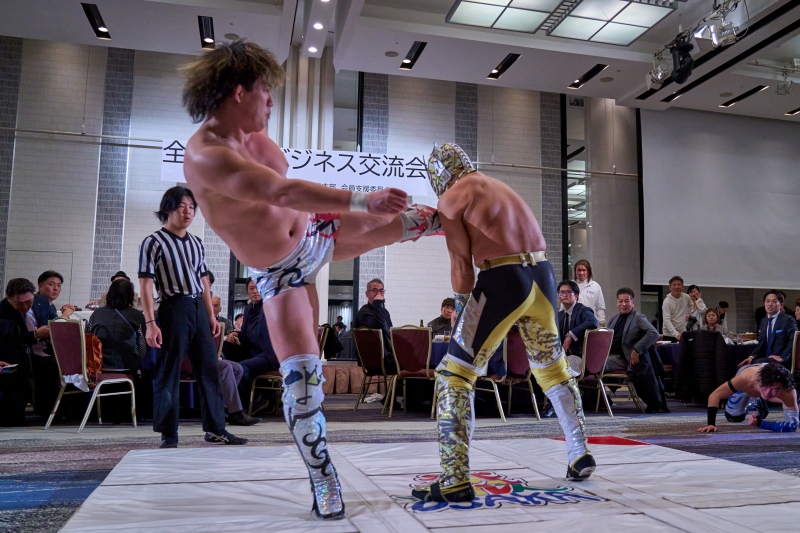 間近でみるプロレスは迫力満点。会場は大いに盛り上がりました。