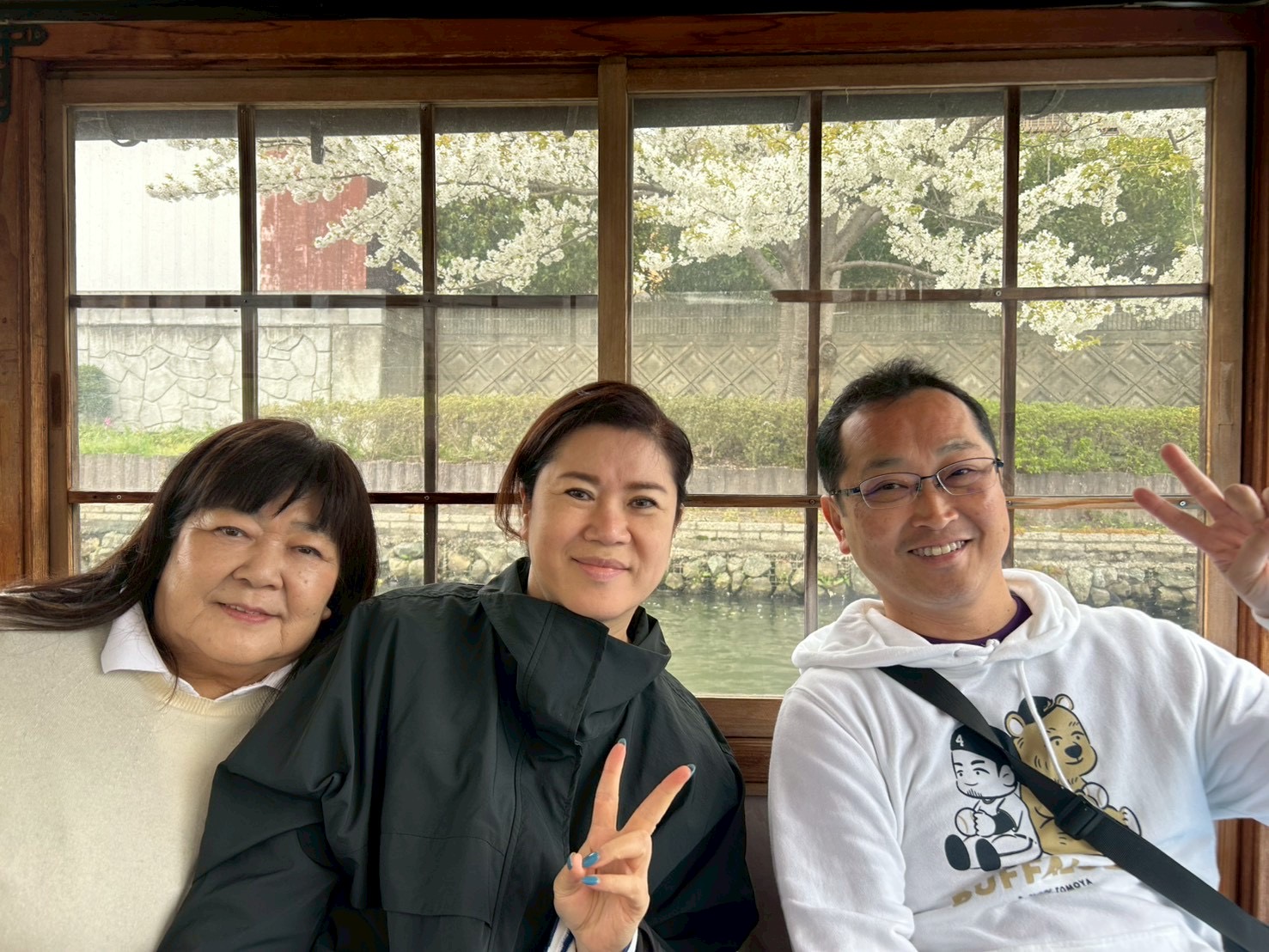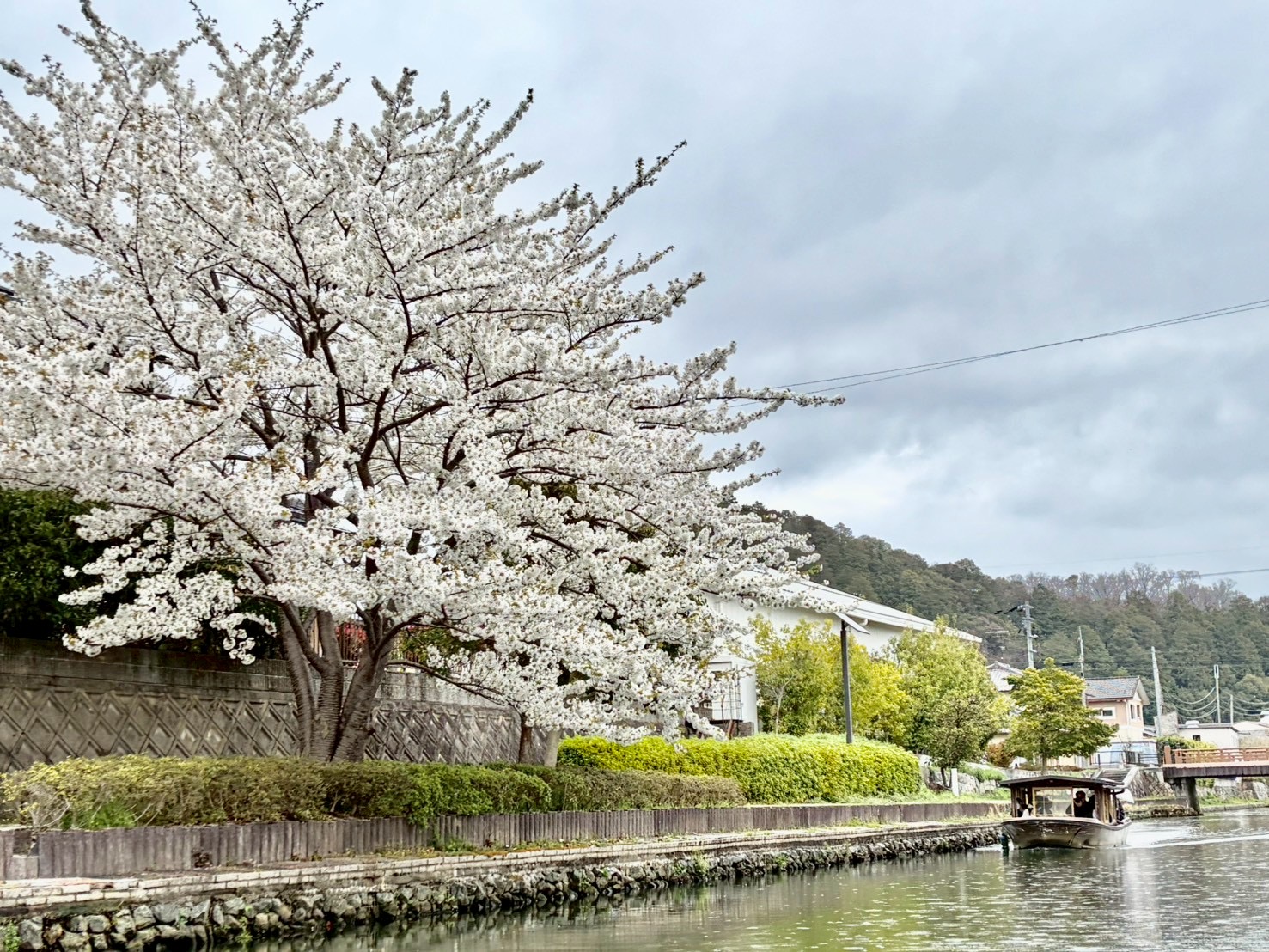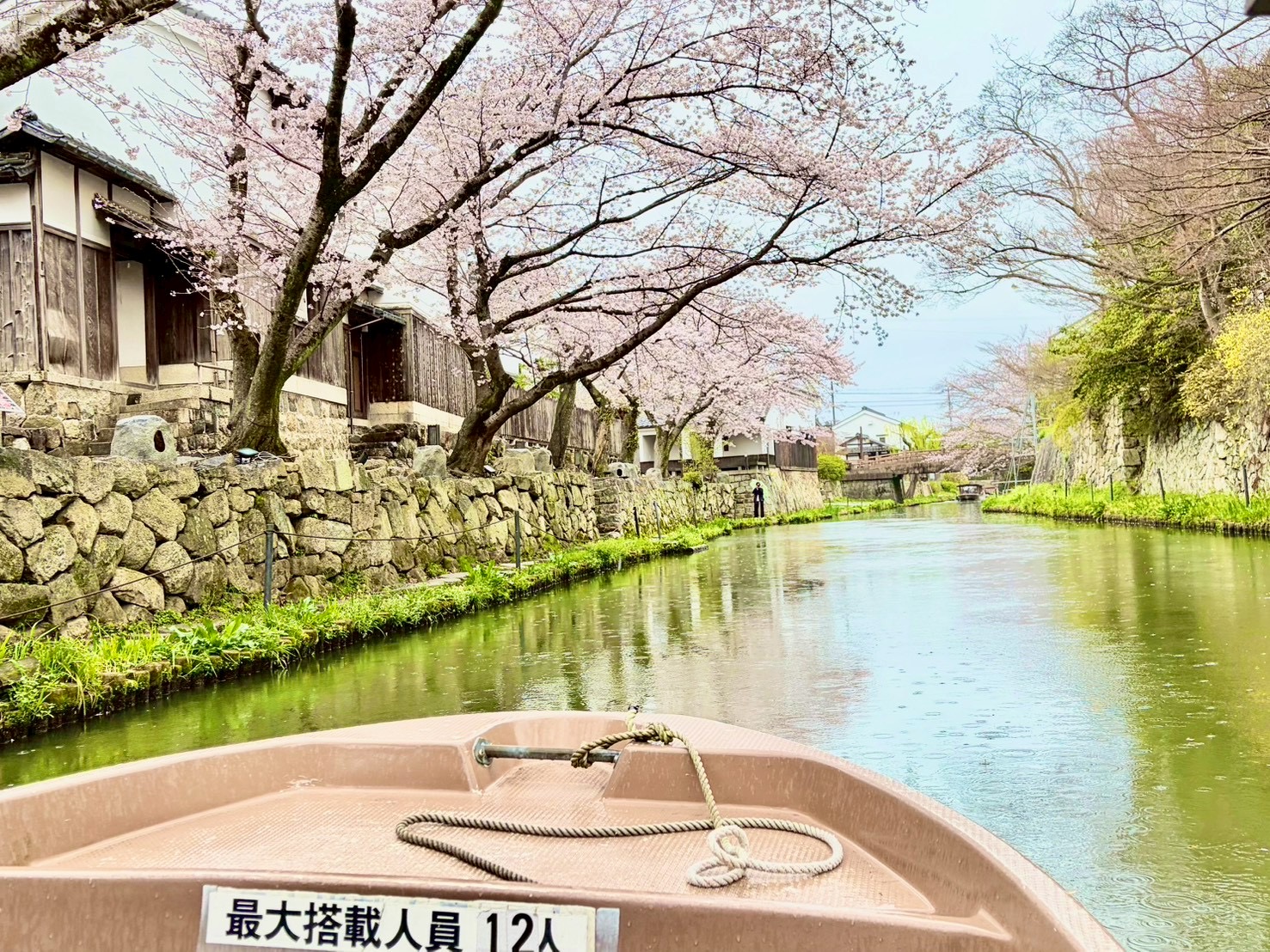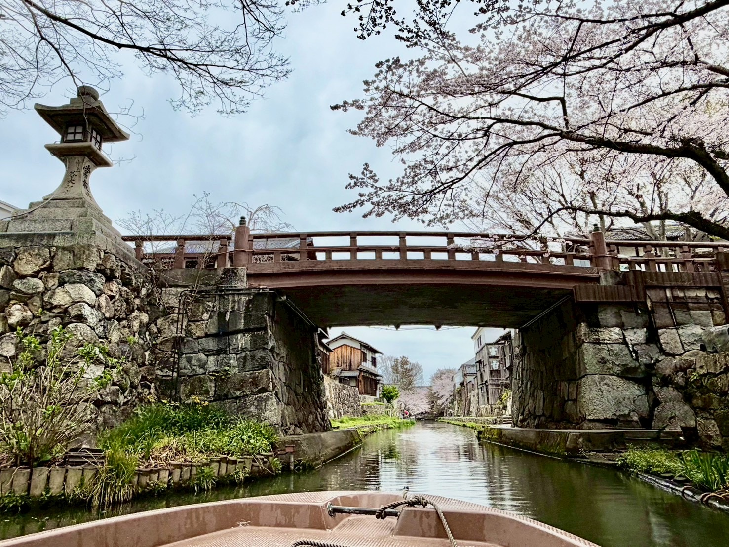 古き歴史ある町並みを後世に伝えています。桜がとても美しいこの時期「八幡堀舟めぐり」を楽しみます。